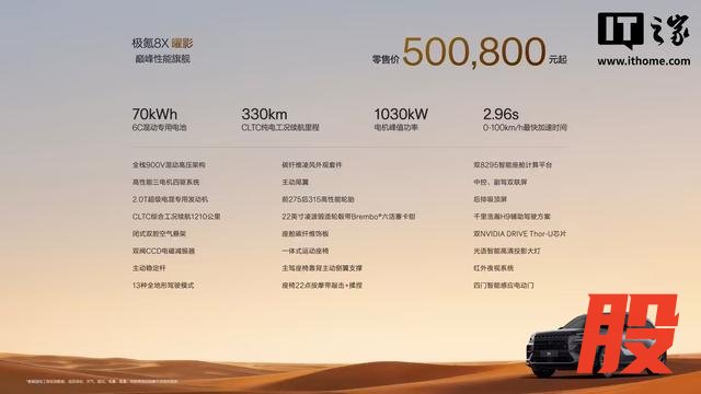 极氪 8X 曜影长宽高分别为 5108 毫米、2026 毫米、1780 毫米,轴距为 3069 毫米;百公里最快加速时间 2.96 秒,搭载混动领域首个三电机兆瓦电驱,峰值功率 1030kW,马力超 1400PS。